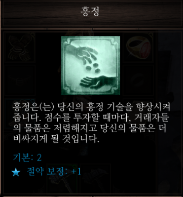 똑같이 흥정만 찍어줬을 때 다른 캐릭터들보다 싸게 살 수 있는데