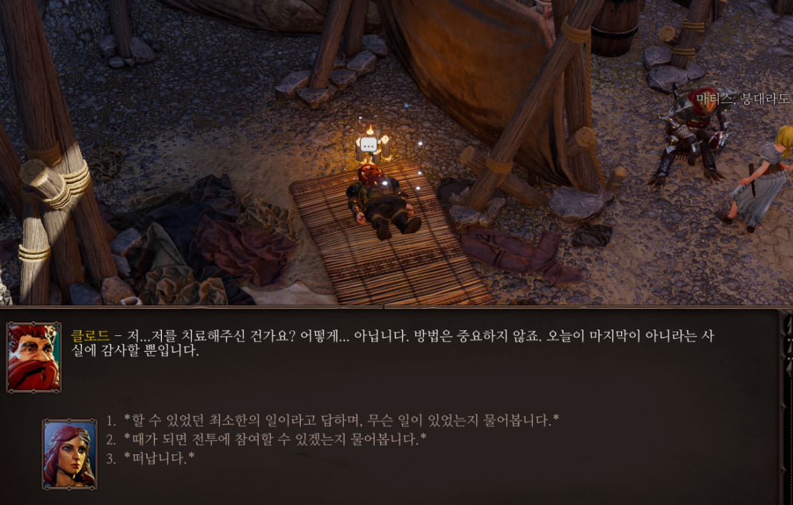 누워있는 쥴스와 클로드 앉아있는 마티스를 모두 치료해주면 경험치를 받으며