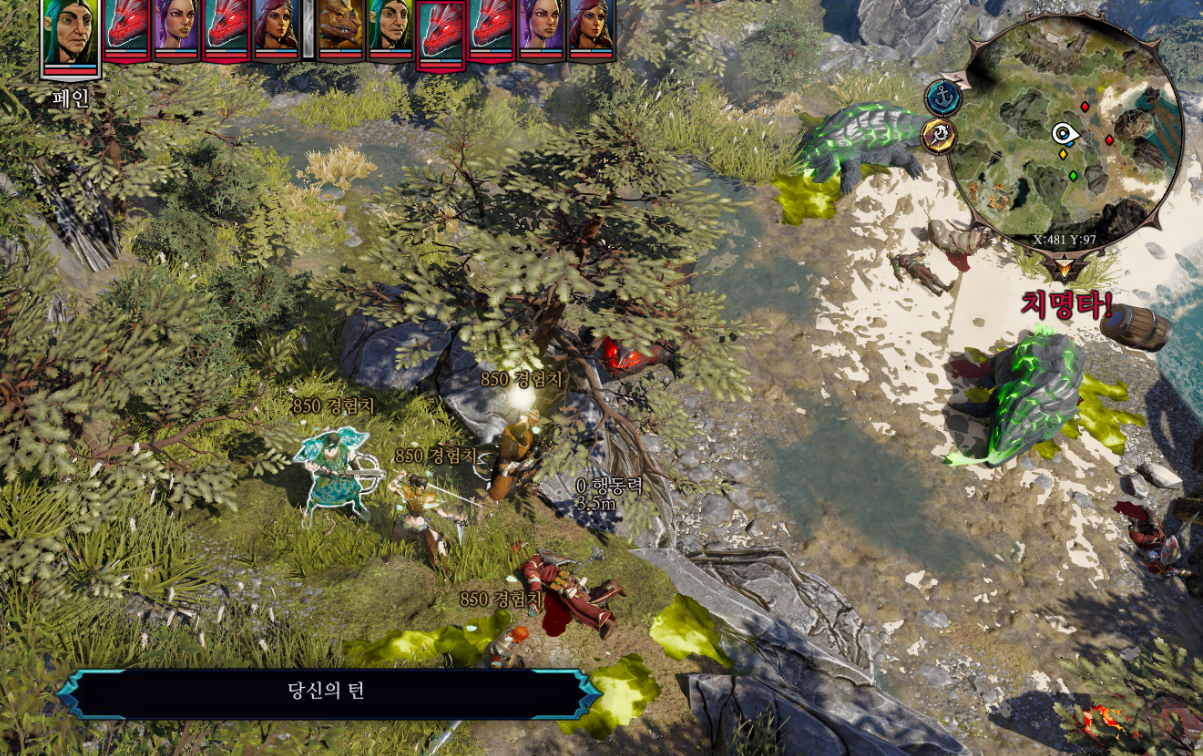 앞에 도룡뇽이 보이는데 평지에서 싸우면 좀 출혈이 있기 때문에 무조건 고지대로 올라간 후