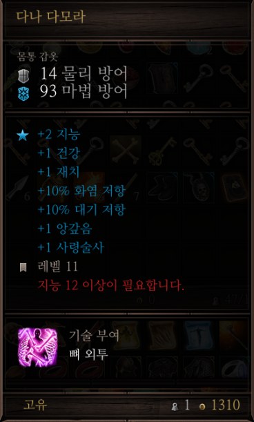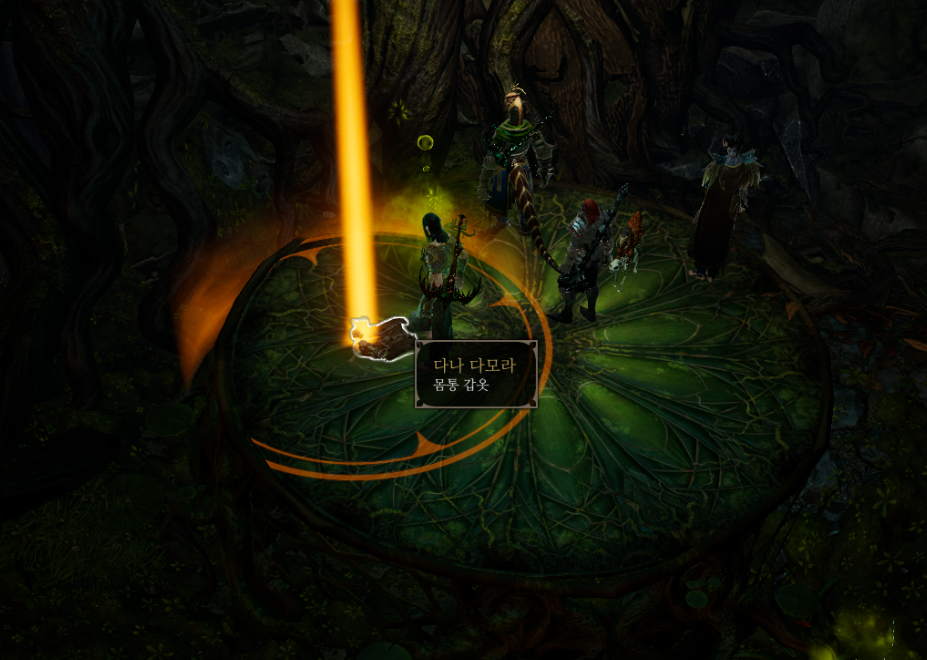 아이템을 챙기고 처음 엘프가 서 있던 곳에서 다나 다모라라는 유니크 마법사 아머를 발견할 수 있는데