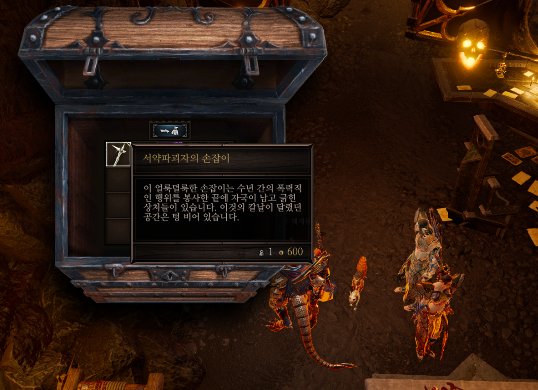 이후 왼쪽 방으로 들어가 상자들을 뒤지다 보면 나오는 서약파괴자의 손잡이를 잊지 말고 챙겨가자