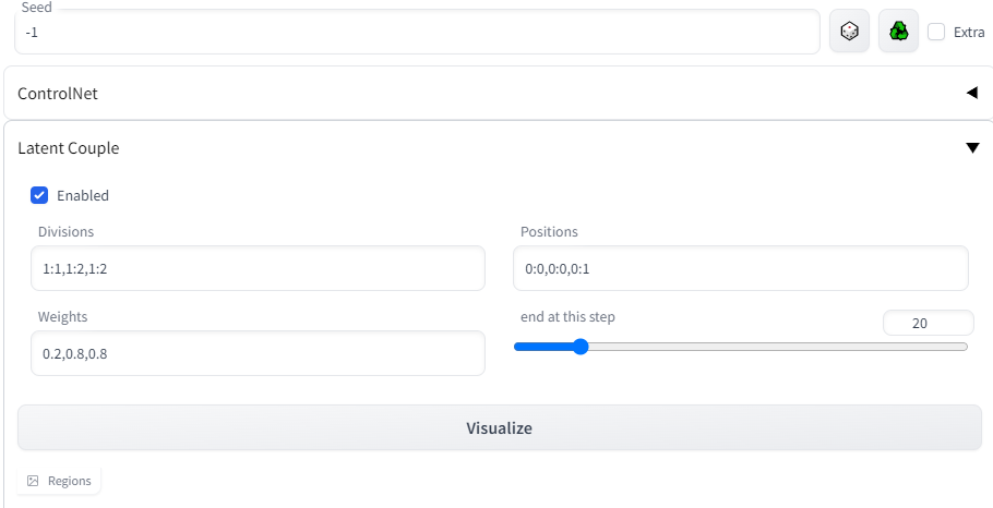 Latent Couple: "divisions=1:1,1:3,1:3,1:3 positions=0:0,0:0,0:1,0:2 weights=0.2,0.8,0.8,0.8 end at step=20"
