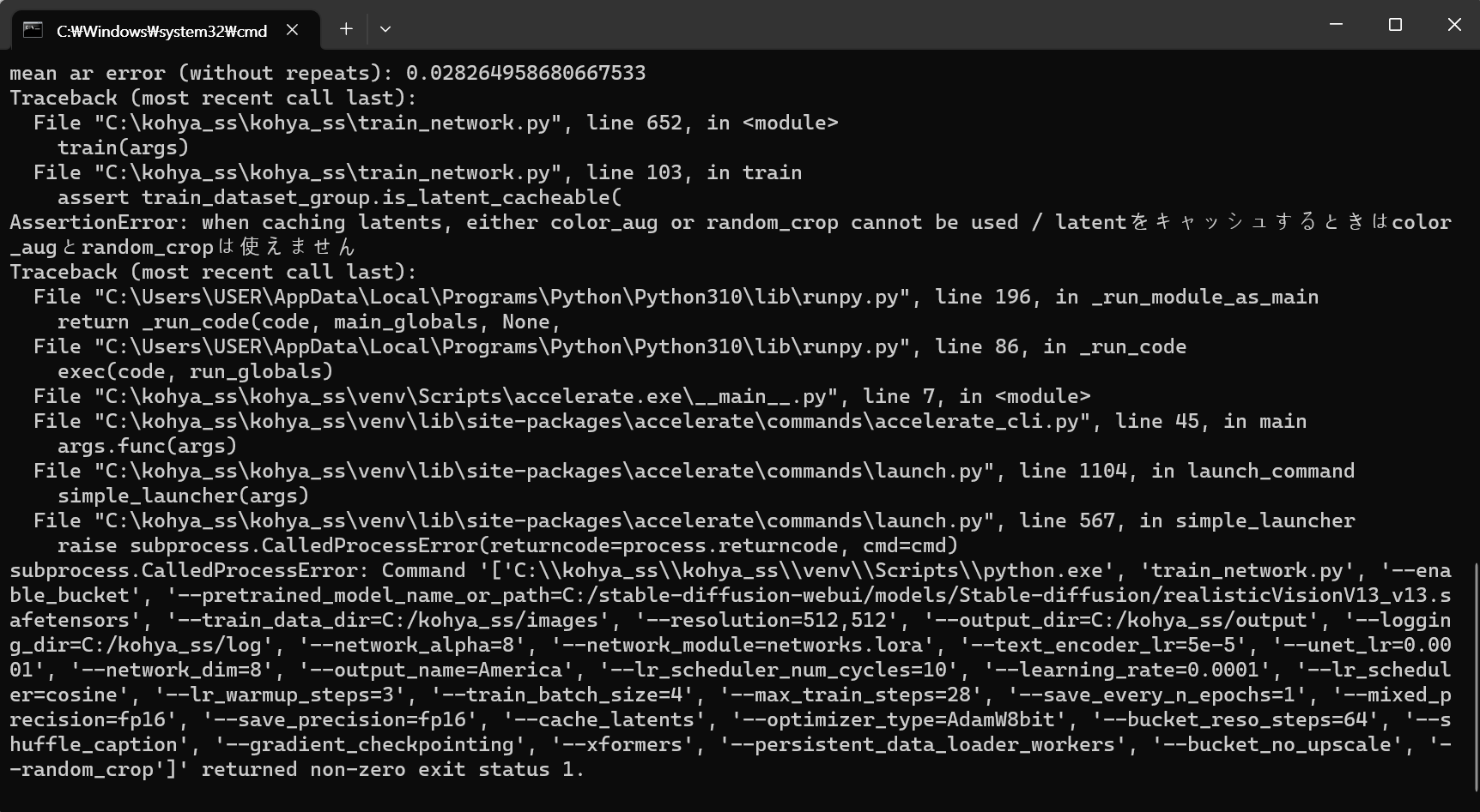 AssertionError: when caching latents, either color_aug or random_crop cannot be used / latentをキャッシュするときはcolor_augとrandom_cropは使えません