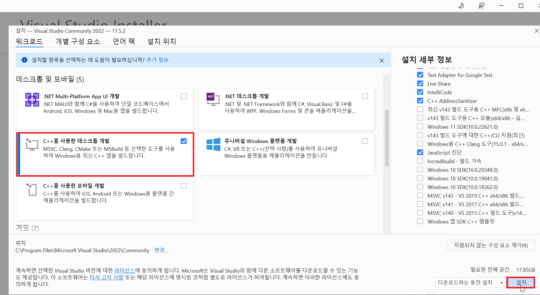 Visual Studio 2022 Community 버전을 다운로드 한 후