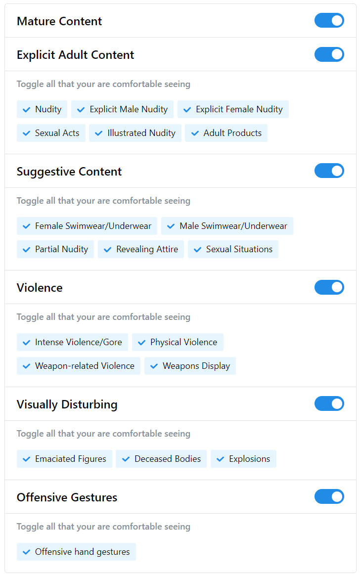Mature Content, Explicit Adult Content를 포함한