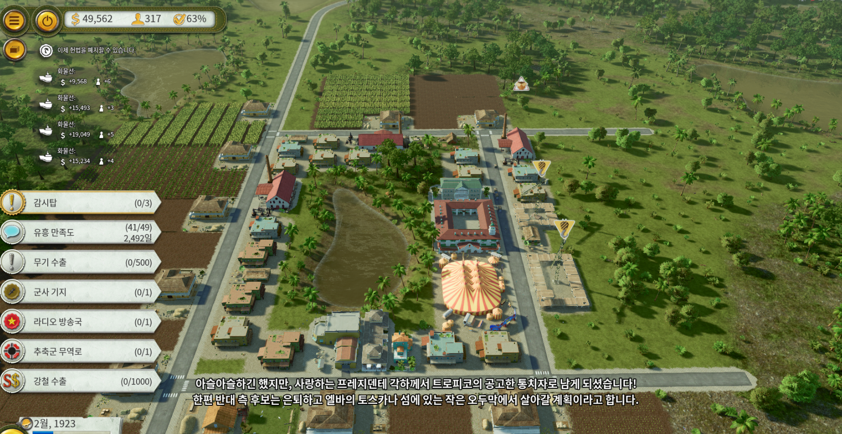 쉽게 공략하는 방법은 설탕 농장과 럼주 증류소를 계속 늘려주면서 럼주를 수출하면 되고