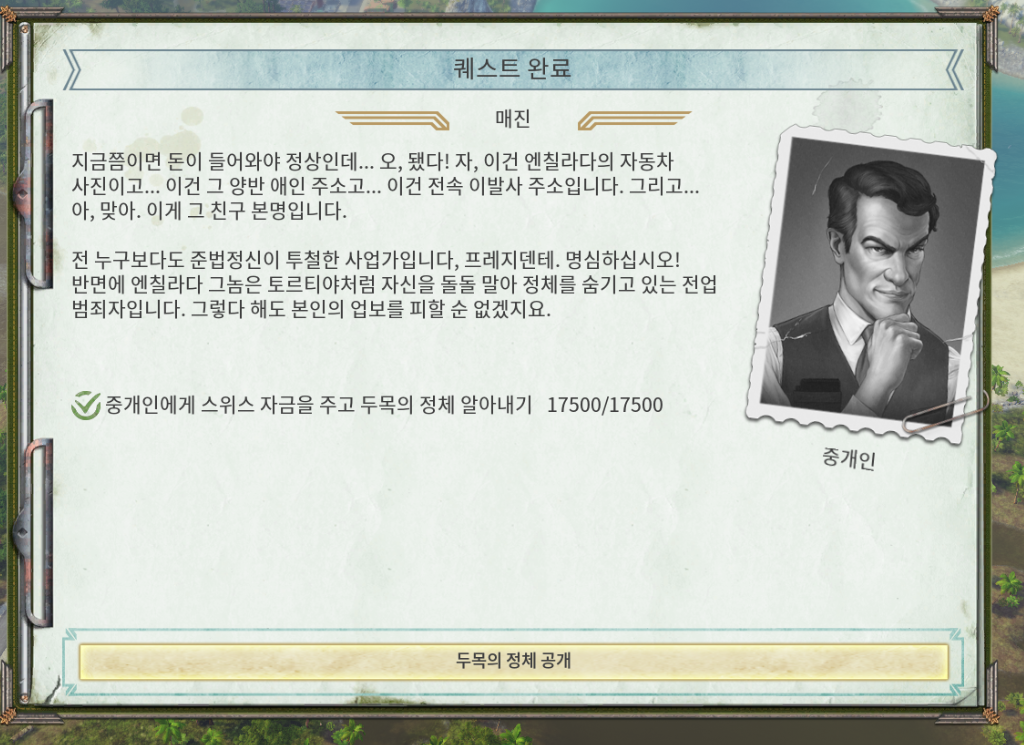 마지막으로 중개인에게 스위스 자금을 주면 두목의 정체를 알아낼 수 있게 되는데