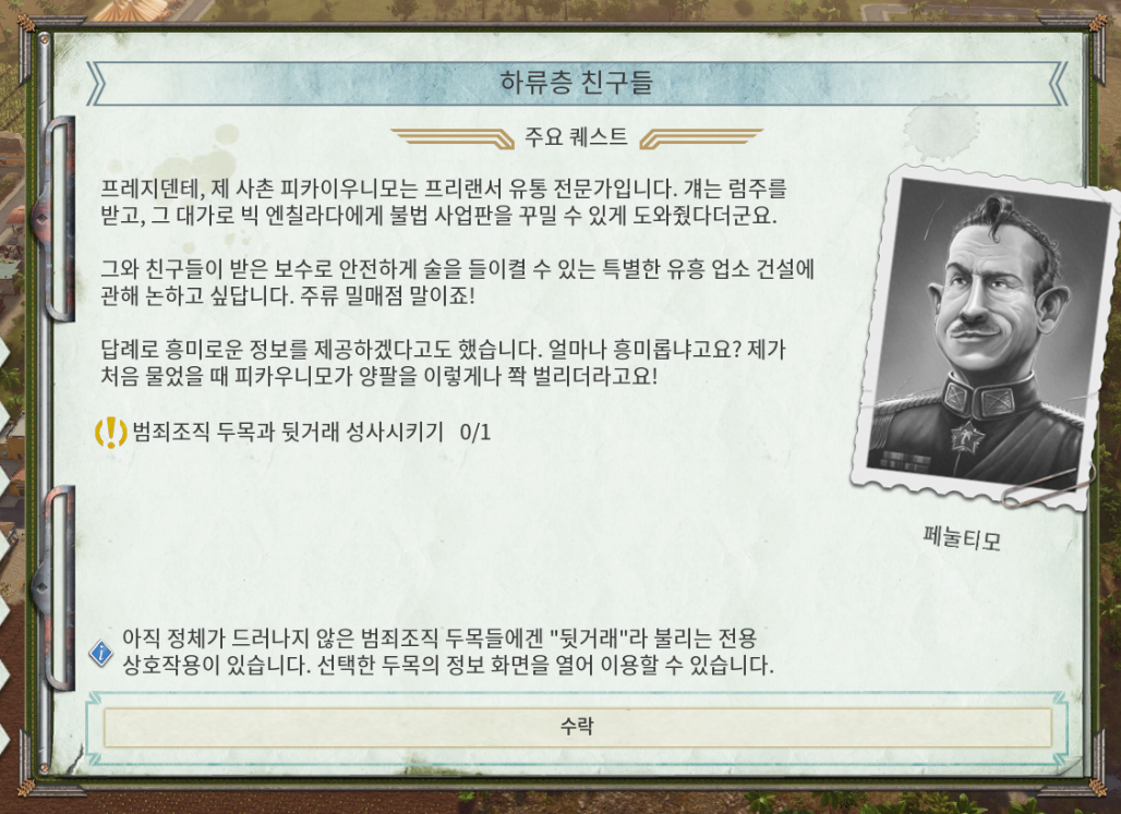 범죄조직 두목이 보이는데 여기서 뒷거래를 눌러주면 된다