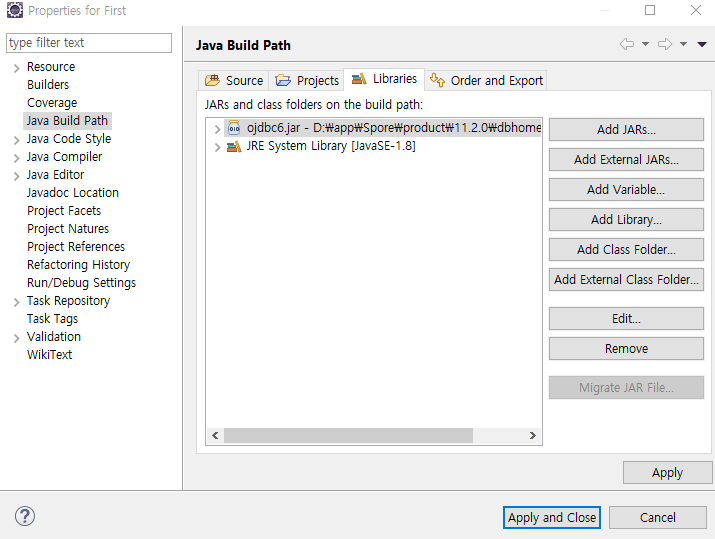 이렇게 ojdbc6이 추가가 되었으면 Apply and Close를 누르자
