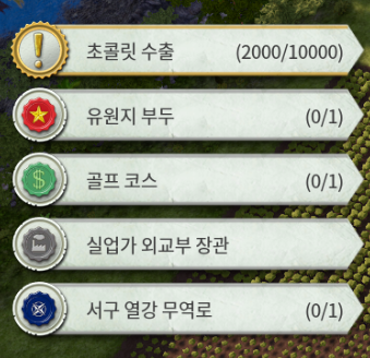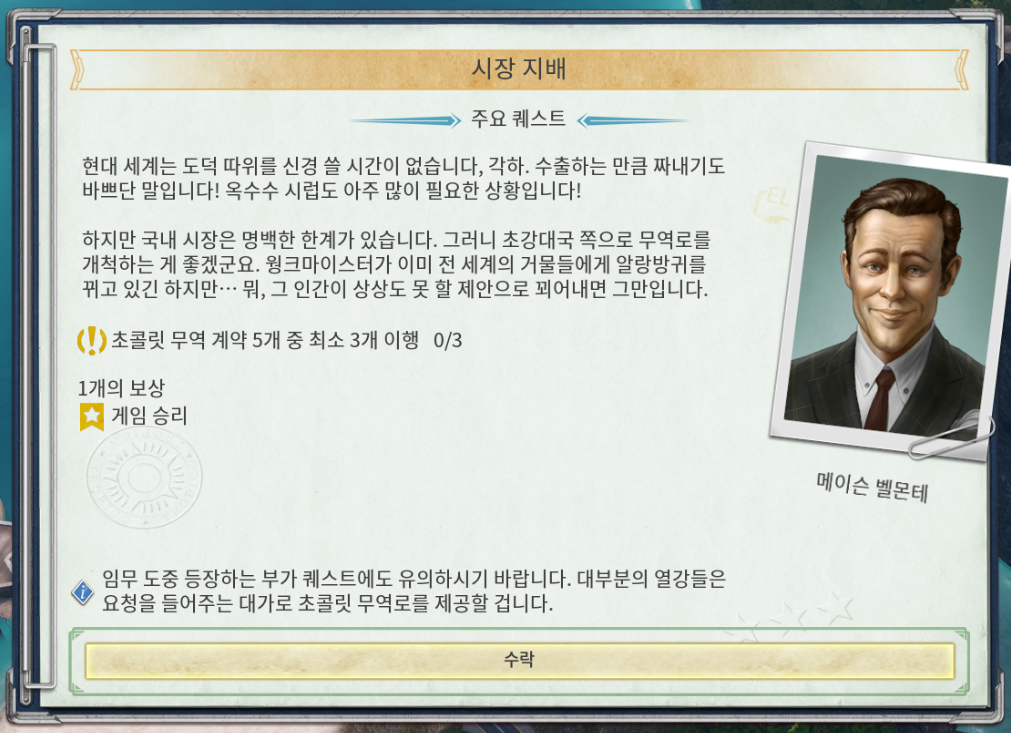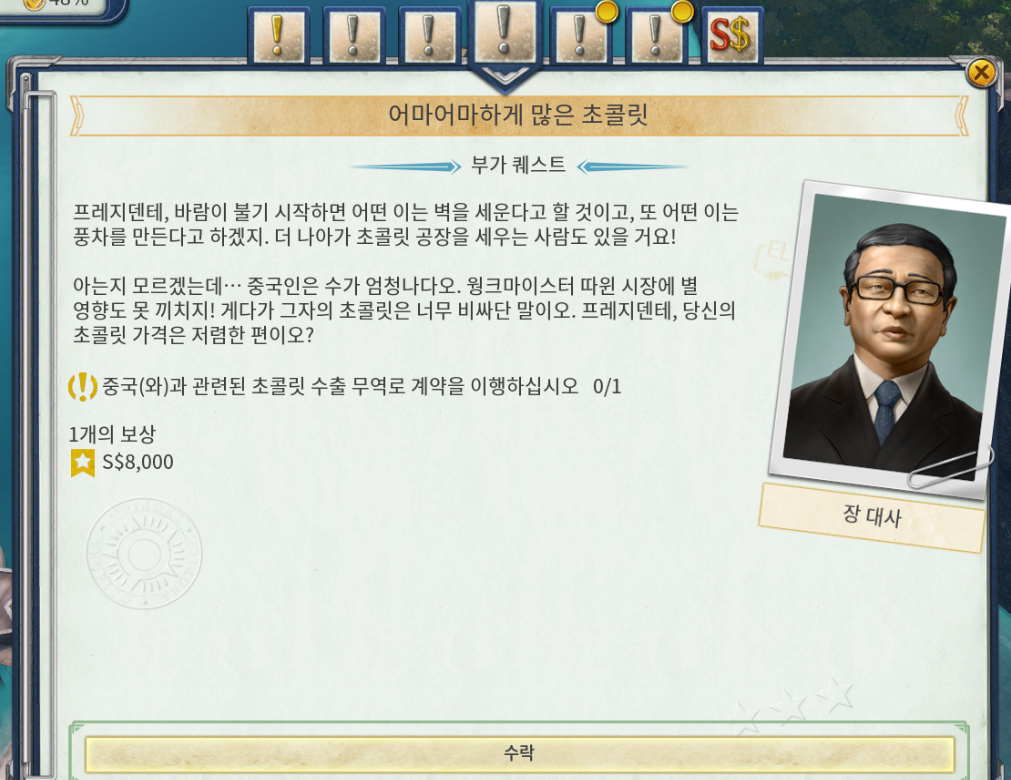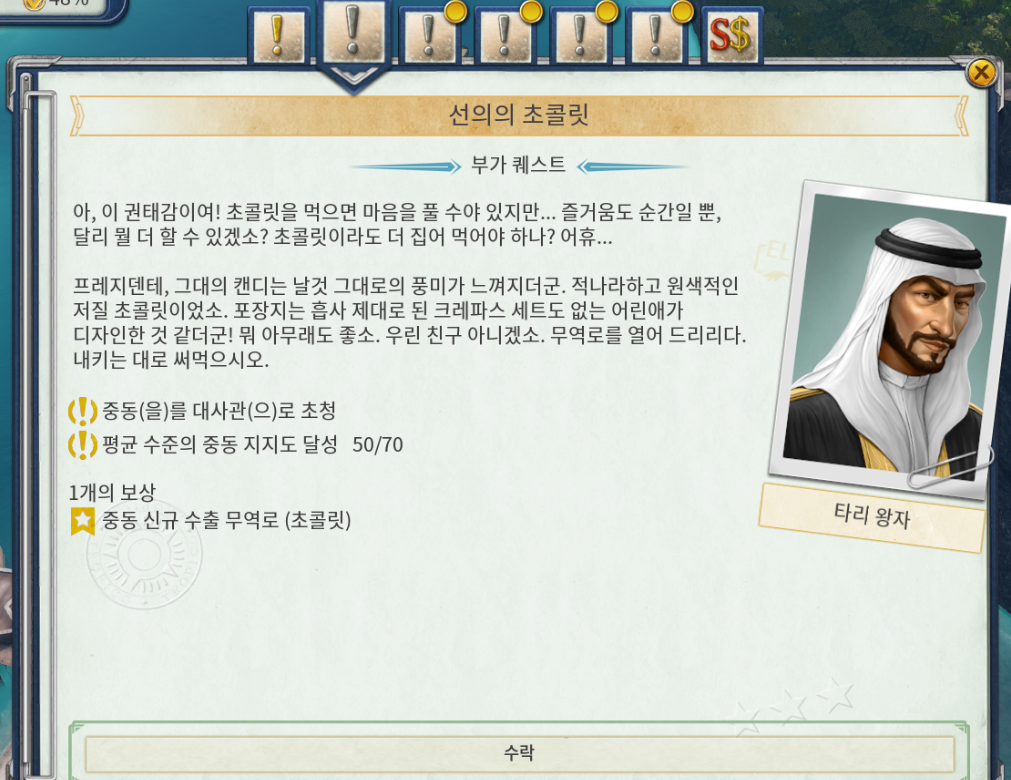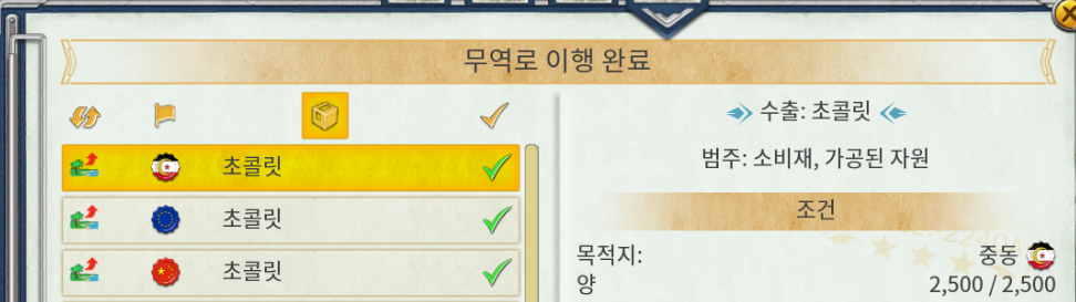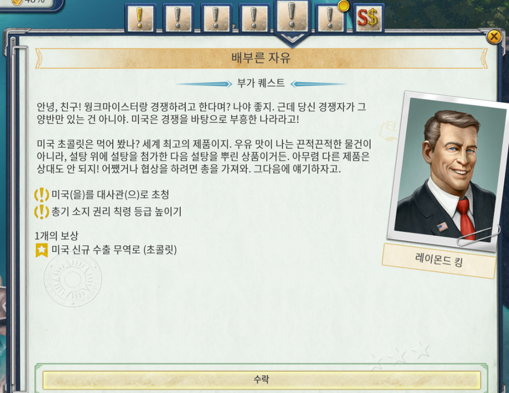 미국에 초콜릿을 팔아보기도 전에 중국, 유럽연합, 아랍 순으로 초콜릿을 다 팔아서 시장 지배 퀘스트가 끝이 났다