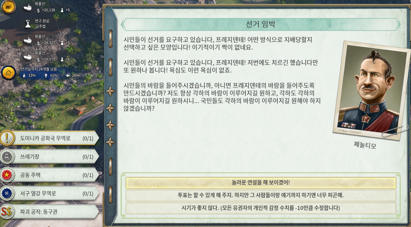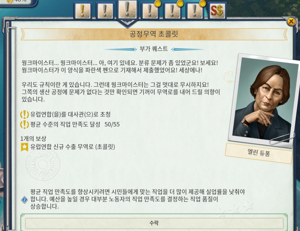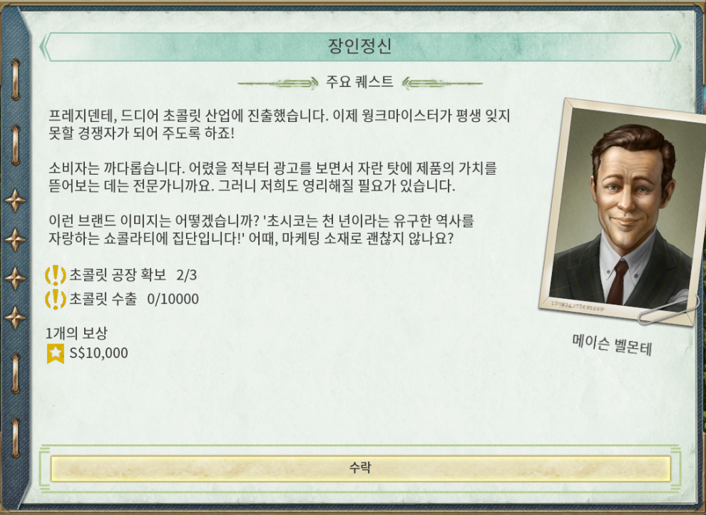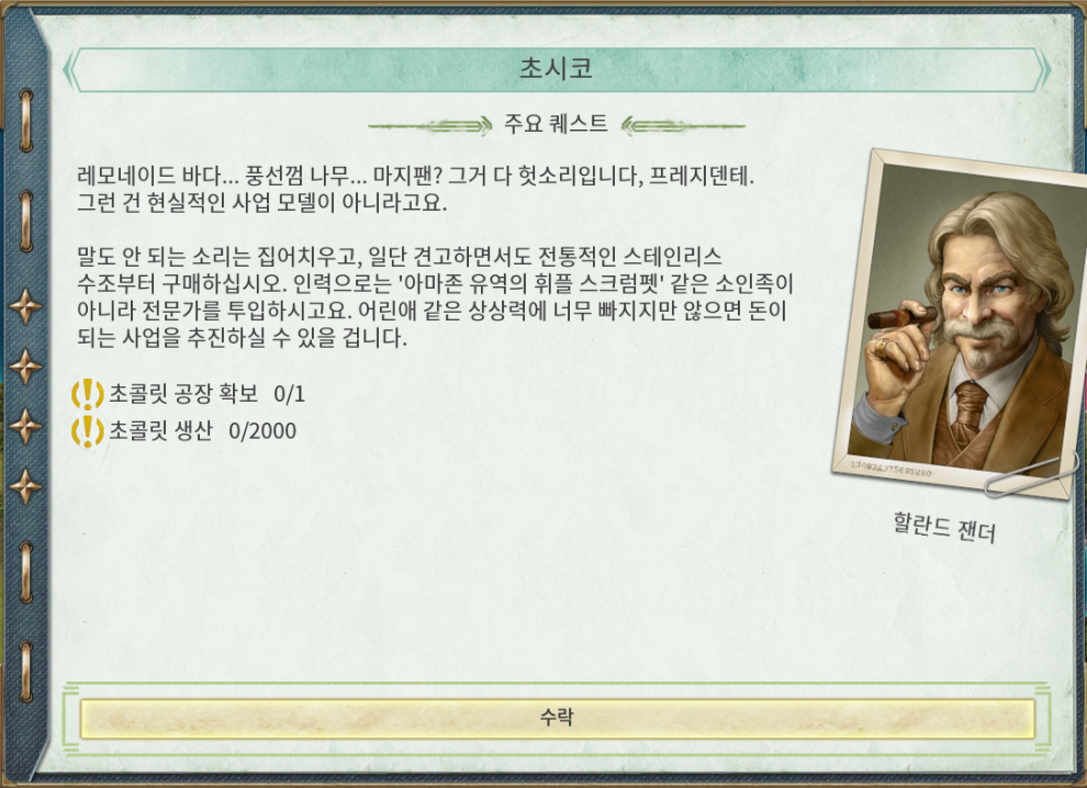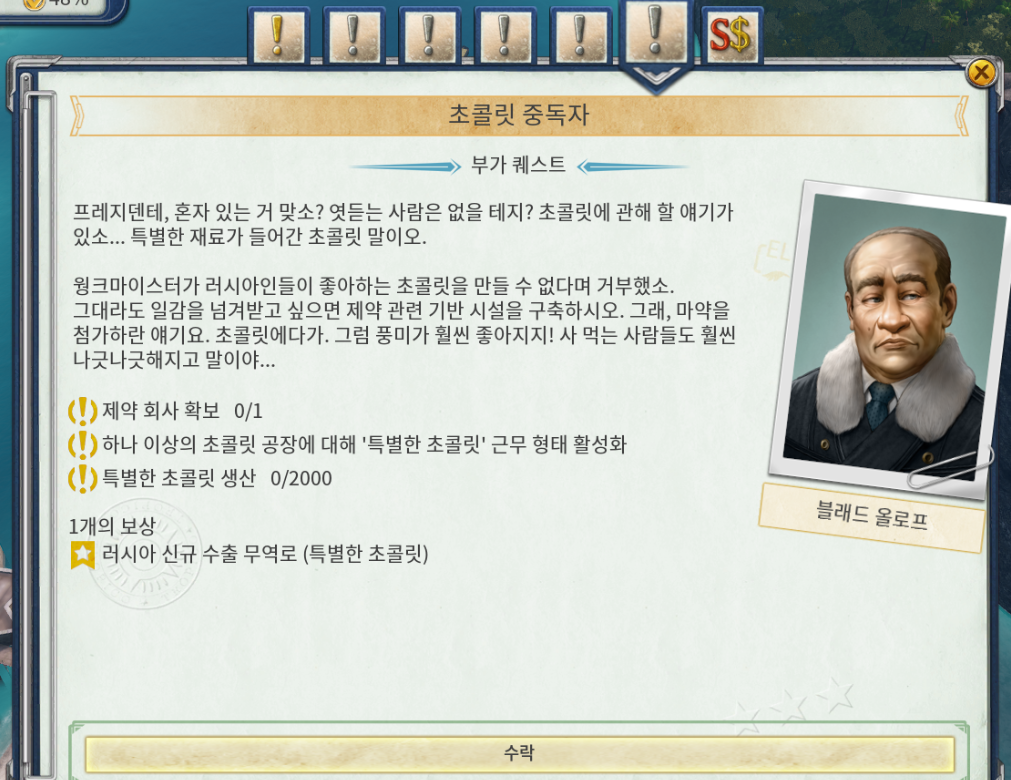 미국에 초콜릿을 팔아보기도 전에 중국, 유럽연합, 아랍 순으로 초콜릿을 다 팔아서 시장 지배 퀘스트가 끝이 났다