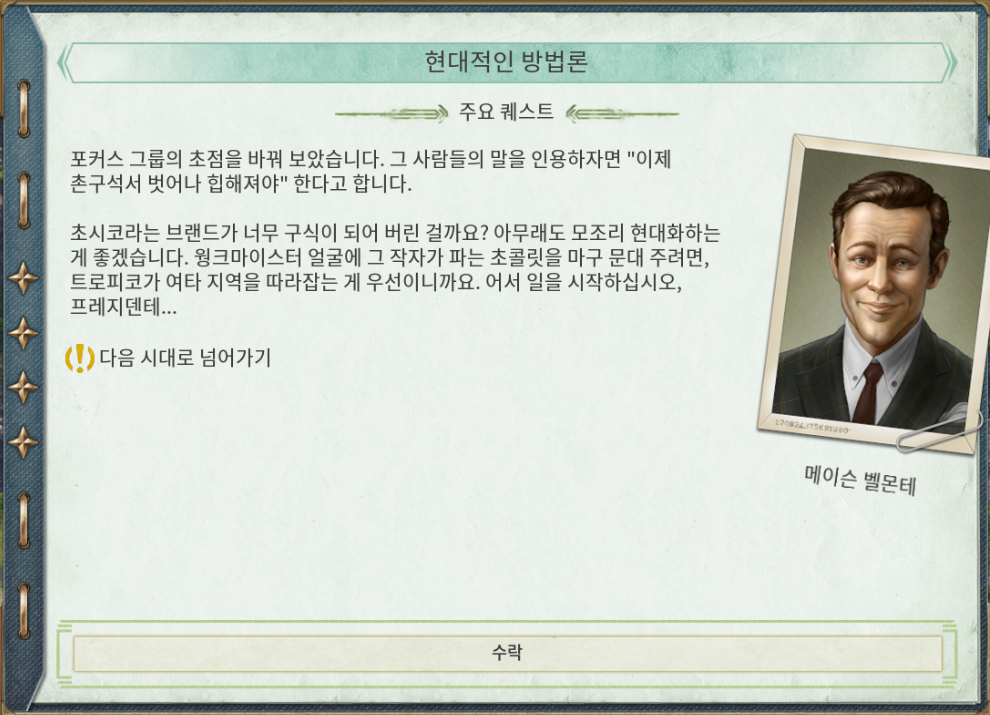 이제 초콜릿 만 개를 수출했으니 현대 시대로 넘어가야 하는데