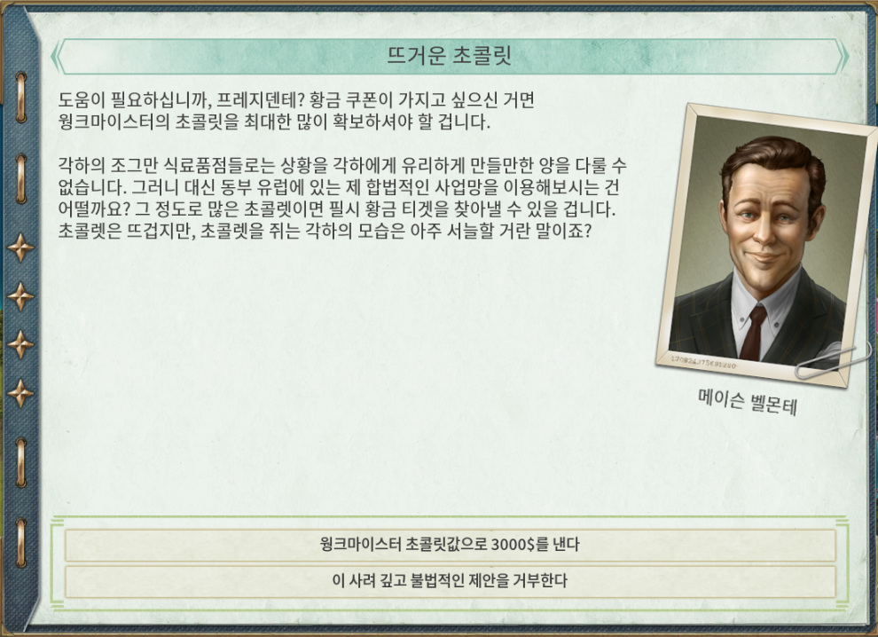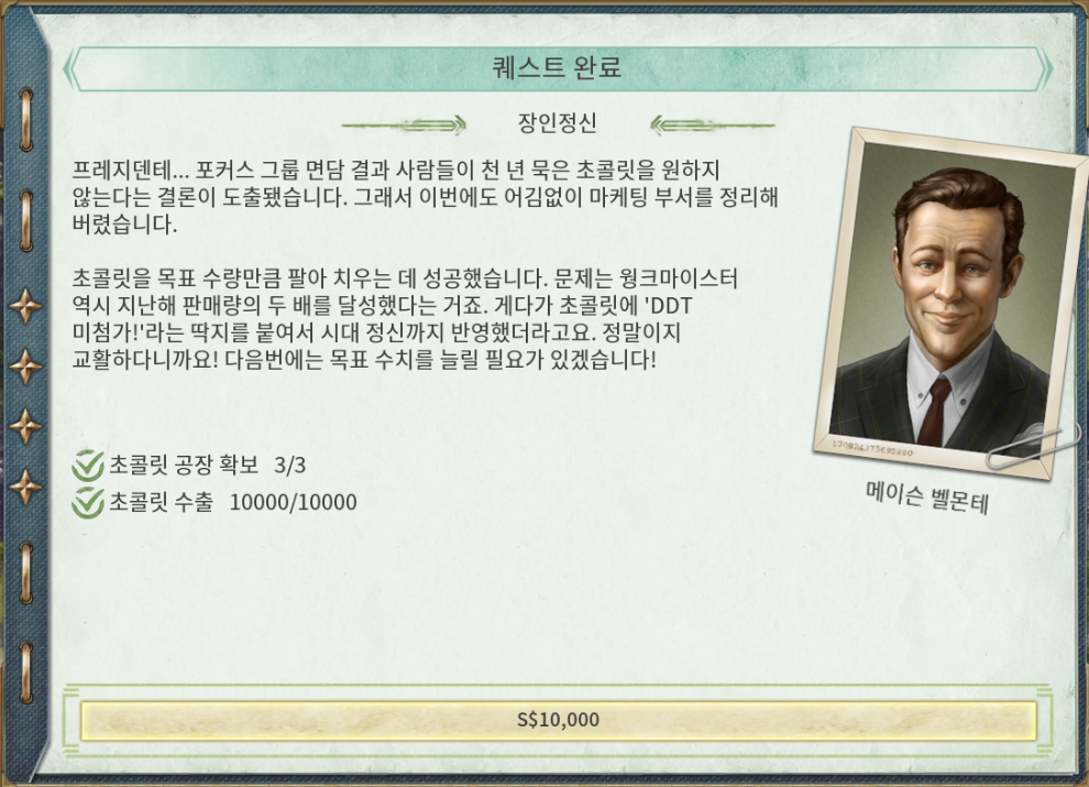 초콜릿 계약을 3번 이행하면 게임에 승리하며 초콜릿 공장 임무는 끝이 난다