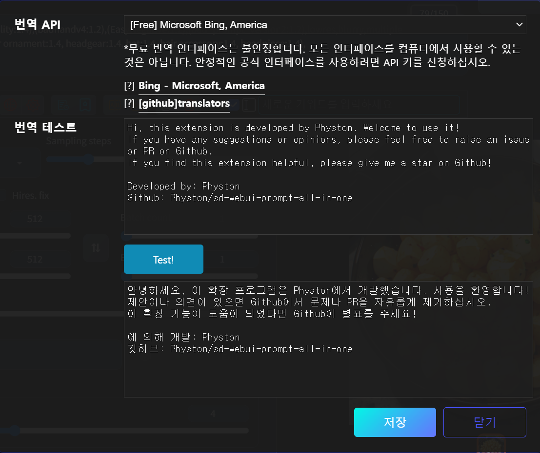 번역 API를 Bing 이나 Google로 변경한 뒤 저장을 눌러주자