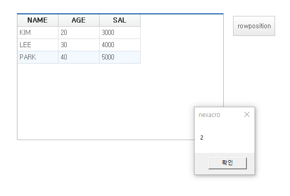 실행해서 2번째 행을 선택하고 rowposition 버튼을 누르니