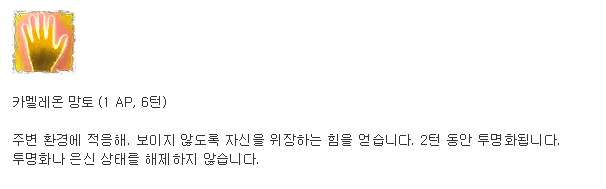 촉수 강타, 카멜레온 망토, 닭의 발톱 (변신술 1부터)