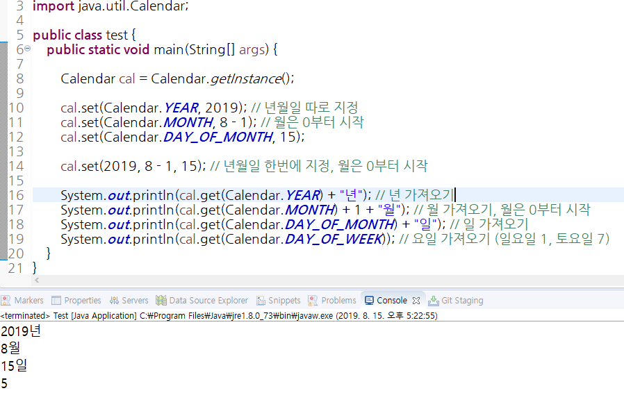 cal.set(2019, 8 - 1, 15); // 년월일 한번에 지정, 월은 0부터 시작